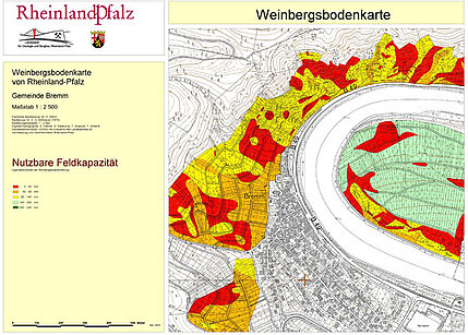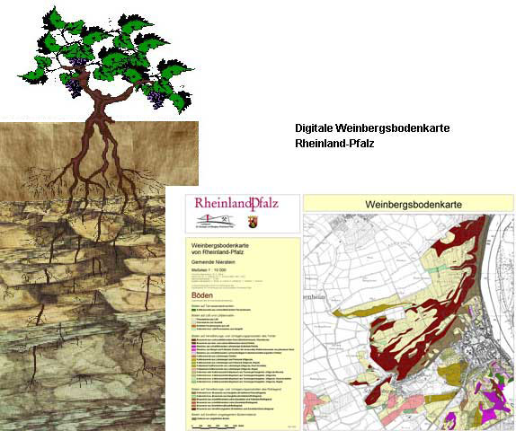 Bodeneigenschaften wie Wasserspeicherfähigkeit oder Nährstoffverfügbarkeit bestimmen nicht nur das Wachstum der Reben, sondern beeinflussen auch den Charakter der Trauben und somit den Geschmack des Weines. Der Boden übernimmt eine entscheidenden Bedeutung für den standortangepassten Weinbau und damit für eine nachhaltige Entwicklung der Weinbaugebiete. Bei der Klassifizierung der Weinbergslagen als "Terroir" spielt der Boden neben dem Faktor Klima eine zentrale Rolle (Böhm et al. 2004). Die Bodenverhältnisse aller Weinbauregionen in Rheinland-Pfalz sind in handgezeichneten Weinbergsbodenkarten festgehalten, die in Verbindung mit umfangreichen Kartenlegenden über Boden und Standorteignung Auskunft geben. Im Projekt "Digitale Weinbergsbodenkarte Rheinland-Pfalz" werden diese "analogen" Daten digitalisiert und aufgearbeitet. Mit der modernen digitalen Weinbergsbodenkarte können Informationen zu allen Bodeneigenschaften in beliebiger Kombination als Karten dargestellt und parzellenscharf, d. h. bis auf einen speziellen Weinberg genau wiedergegeben werden.