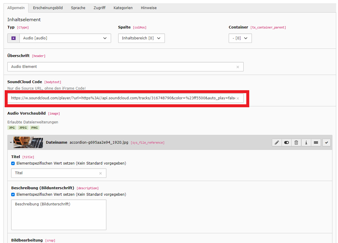 In jeder Seite können Inhaltselemente vom Typ "Audio" angelegt werden. Die Spezifikation welcher Beitrag von Soundcloud angezeigt/abgespielt werden soll erfolgt durch Hinterlegen einer URL im markierten Bereich.
