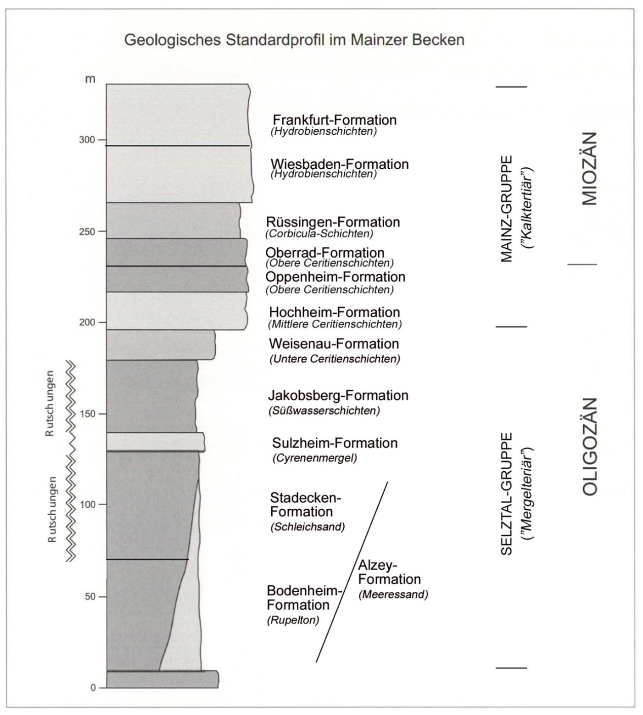 Geologisch baut sich das Mainzer Becken im Wesentlichen aus den sedimentären Ablagerungen des Tertiärs auf, die sich in die liegenden schluffig-mergeligen Schichten der Selztal-Gruppe des Oligozäns (Mergeltertiär) und die darüber folgenden kalkigen Sedimente der Mainz-Gruppe aus dem oberen Oligozän und dem Miozän (Kalktertiär) unterteilen lassen. Die Rutschungen treten insbesondere in den sandigen Tonmergeln des Oligozäns auf. Besonders betroffen sind die Schichten der Stadecken-Formation (ehemals: Schleichsand) und der Jakobsberg-Formation (ehemals: Süßwasserschichten), untergeordnet auch die Ablagerungen der Sulzheim-Formation (ehemals: Cyrenenmergel) und der Bodenheim-Formation (ehemals: Rupelton). Diese Schichtpakete bauen häufig die durchschnittlich mit 4 - 15° geneigten, flachen Hänge auf und können selbst bei geringsten Hangneigungen noch Kriechbewegungen zeigen. Typisch sind wellenartige Verformungen im Hang, Vernässungsstellen und verkippte Rebstöcke, die auf anhaltende Kriechbewegungen schließen lassen. Die Gleitflächen können bis in Tiefen von etwa 20 m reichen, meist handelt es sich jedoch um flache, ausgedehnte Rutschungen von 2 - 5 m Mächtigkeit.