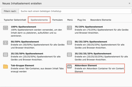 Das Akkordeon dient, ähnlich wie die verschiedenen Spaltenelemente, der Gruppierung von Inhaltselementen.